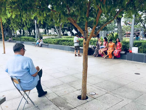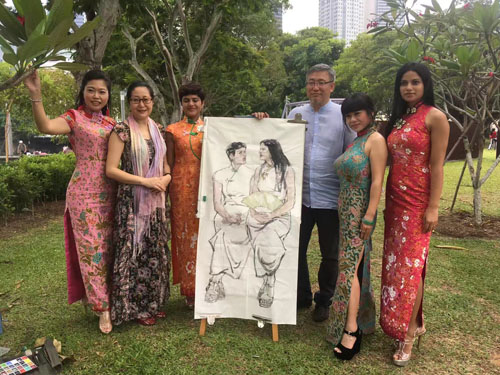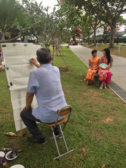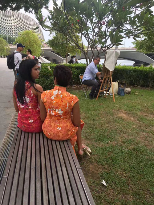张智栋老师在新加坡河畔,为印度佳丽现场人物写生