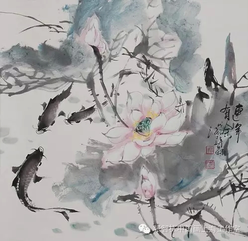 清澈的池水中,碧波荡漾。鱼儿寻觅,追逐,游离于花开花谢之间,轻轻冉冉。心如净水般清澈,亦能如鱼般欢快畅游。张智栋运用撞色、撞彩的技法将鱼儿悠游自在,清逸、雅丽的超脱跃然纸上。