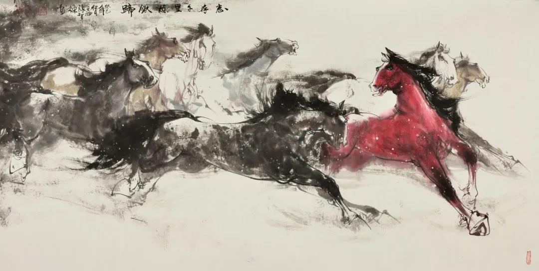 总之画好八骏马是对画家综合能力和绘画技法的考验。在很多人眼中"画马"是一个很通俗的题材,但骏马题材作品近千年来不论中外还是被社会接受度最高的绘画作品题材。怎样才能画出一幅不俗的骏马作品?首先你不能为了画马而画马,这肯定会越画越俗!其次要多画写生多创作,这样才能避免作品出现简单的程式化而导致画出僵、死、板、呆、木等俗气作品。所以你画的是马但表现的却是"广阔的大草原",你画的是马但表现的是"以马喻人的精神",你画的是马但表现的是这个时代的"精、气、神",这样的作品会俗吗?