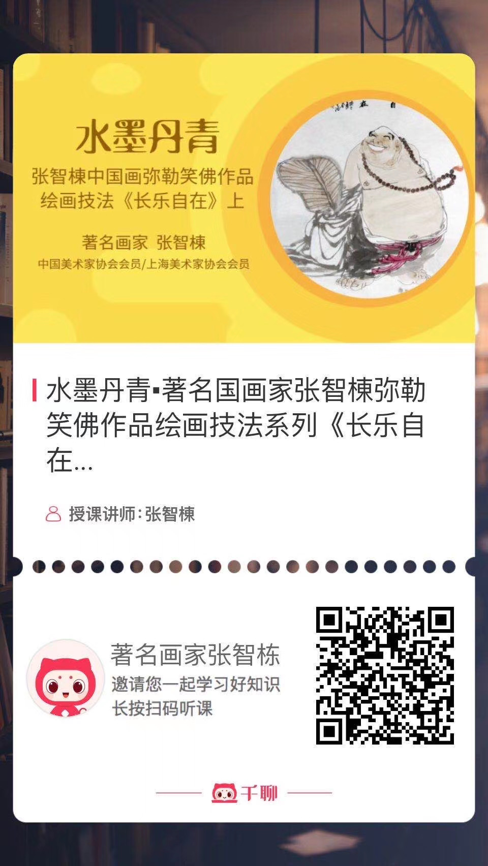 为配合"喜满华夏"张智棟108幅人间弥勒美术创作项目的对外推介,张智棟国画云课堂"弥勒笑佛系列作品绘画技法示范"视频网课第三课《长乐自在》今天在千聊网课平台正式上线了!目前该平台己上线了《满载而归》《欢喜图》等三个示范内容六节网课,后续还将推出《笑口常开》作品示范网课。