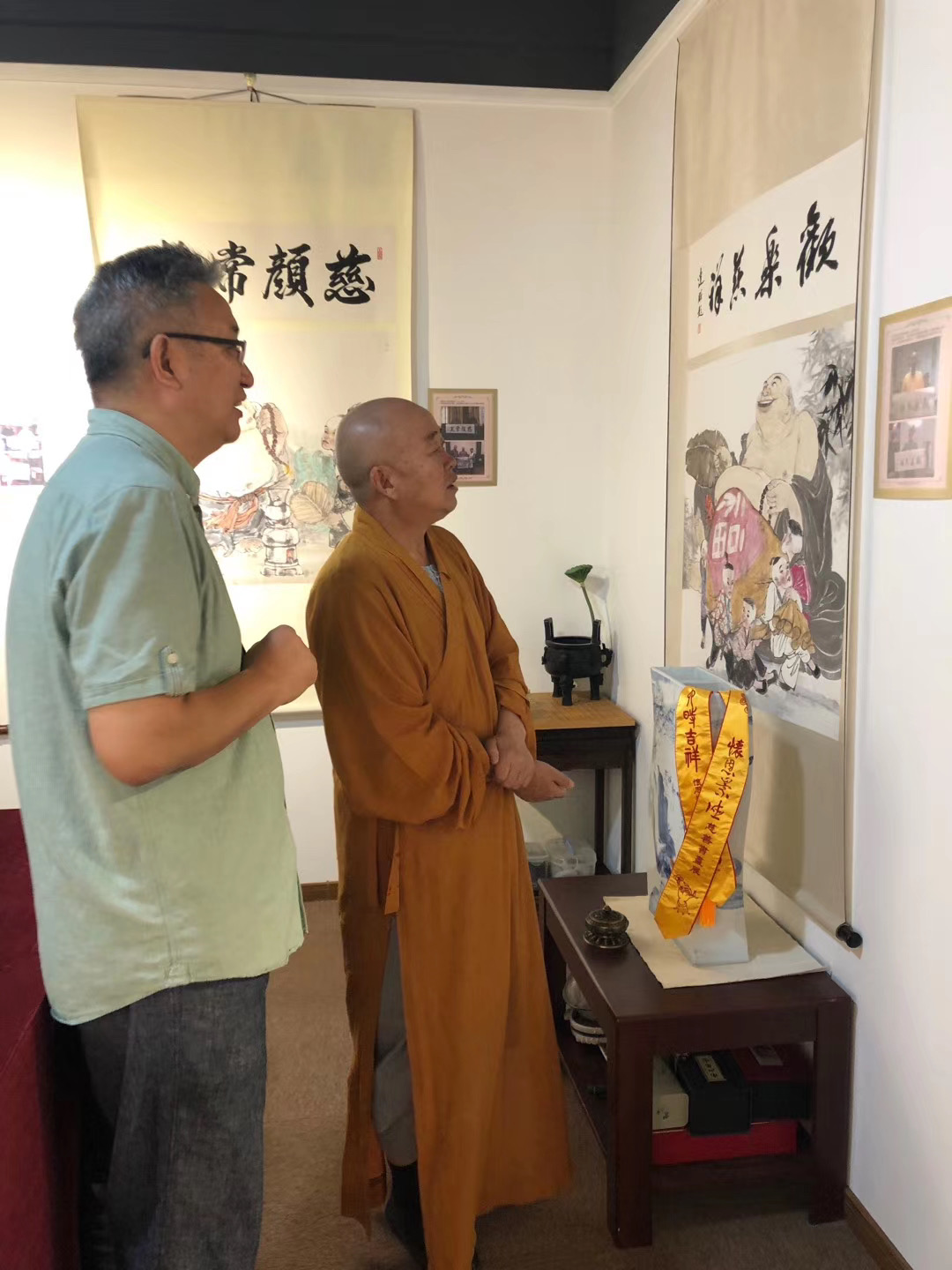 7月17日江苏省南京市佛教协会副会长、玄奘寺传真方丈一行应邀光临上海智明文化传播机构"喜满华夏一张智棟人间弥勒美术创作中心",张智棟老师热情接待并陪同传真方丈参观了"喜满华夏"创作项目工作室、创作冥想闭关室和乐观精舍,后观赏了"张智棟108幅人间弥勒创作作品暨108位亚洲高僧大德题词墨宝作品展"并听取了关于"喜满华夏"创作项目的介绍。