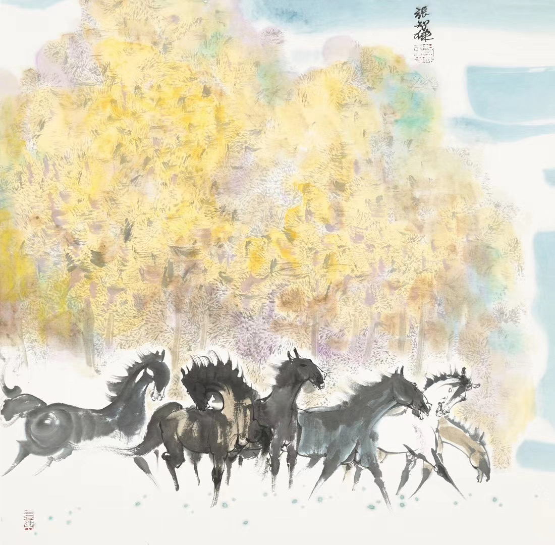 张智棟中国画作品收藏推荐《秋高气爽》,此作品收录于《张智棟宝马系列集邮典藏卷》画册中,并由中国邮政发行作品邮票。