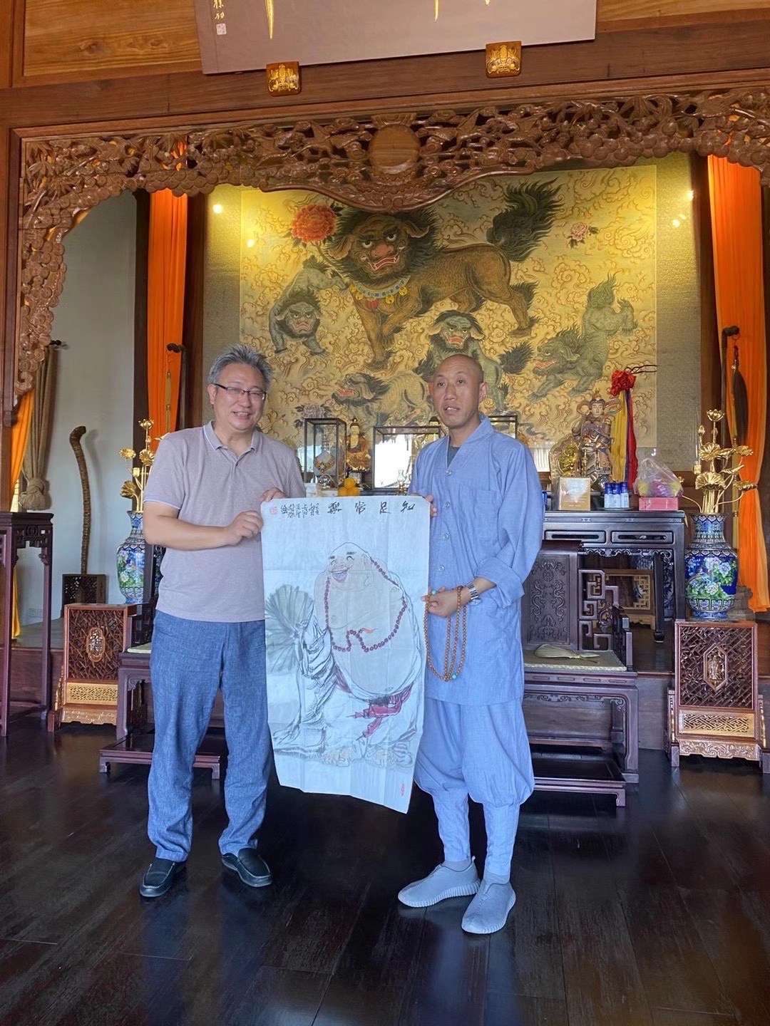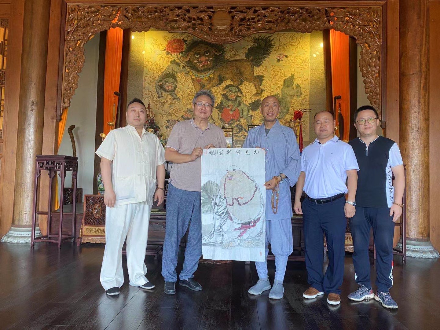 怡藏方丈对创作作品给予了高度赞赏,现场亲笔题词"自在吉祥"并邀请张老师108幅弥勒作品创作完成后的首展在雪窦寺展出,张老师愉快接受怡藏方丈邀请并赠送《知足长乐》作品与雪窦寺结缘。