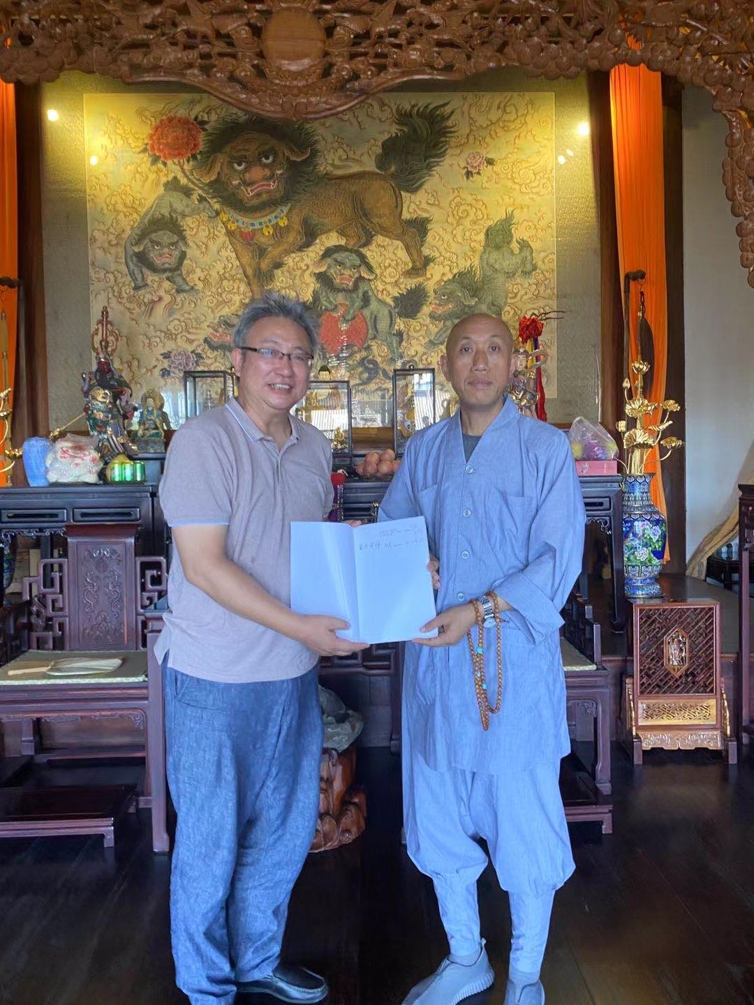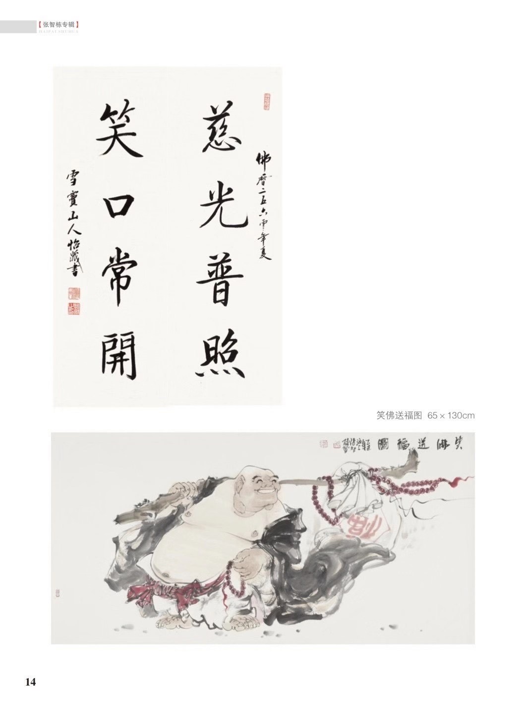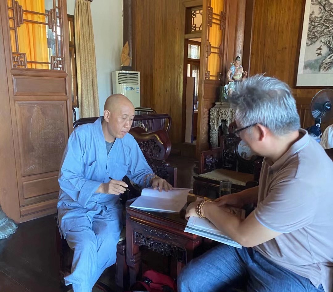 有张老师喜满华夏108幅弥勒作品创作项目合伙人、藏家俱乐部会员、上海博阳企业董事长张宏泉等藏家朋友们一起随行,15日上午拜见了浙江省佛教协会会长、雪窦寺怡藏方丈,张老师向怡藏方丈详细汇报了"喜满华夏一张智棟108幅人间弥勒美术创作"项目进行情况:自张智棟老师二年多前在弥勒大佛前发愿创作108幅弥勒作品并在雪窦寺开笔创作第一幅弥勒作品以来近三年时间已创作70余幅作品、拜访近百所国内外著名寺庙,有70多位亚洲高僧大德与张老师一起创作了弥勒题材书法作品,在中外佛教界产生巨大影响!