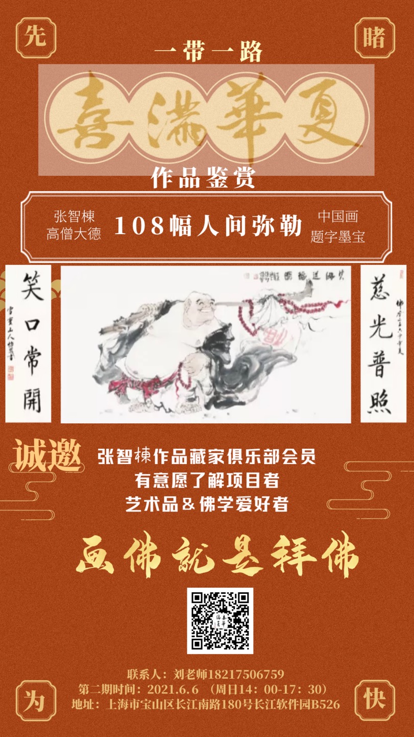 2021年6月6日,第二期一带一路 · 喜满华夏 · 张智棟人间弥勒及高僧大德书画创作作品“先睹为快”品鉴会在宝山区长江南路180号长江软件园B526举行。张老师以“画佛就是学佛”与朋友们分享了五年来108幅人间弥勒项目创作的初衷、过程及经历的各种生动故事。