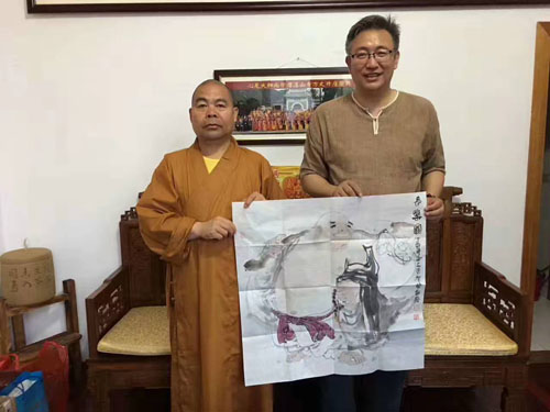 张智栋老师赴青岛市湛山寺拜会心见大和尚,大和尚特地从烟台返回接待,感激不已以画结缘,加持护佑