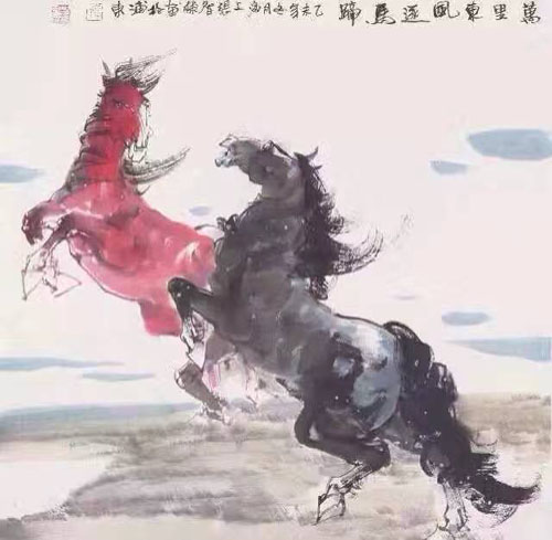 万里东风逐马蹄69×68cm,水墨纸本(镜片),乙未年(2015年)作款识:乙未年冬月,海上張智棟畵於浦東印鉴:張、智棟畵印