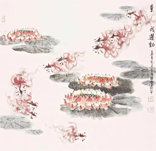 “跃马星洲--水墨画大师张智栋中国画作品展”作品精品收藏推荐 鱼戏莲动62×62cm,水墨纸本(镜片),壬辰年(2012年)作款识:壬辰年冬月,上海張智棟畵印鉴:張、智棟畫印、長樂