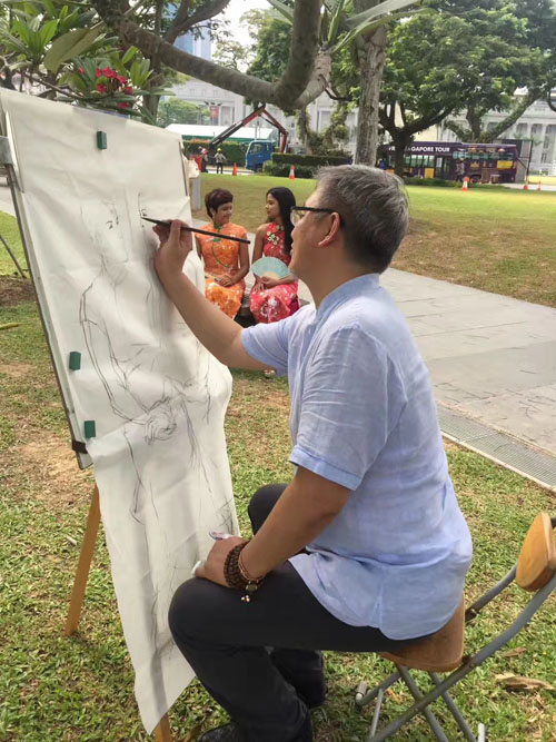张智栋老师在新加坡河畔,为印度佳丽现场人物写生