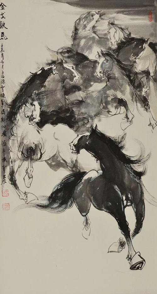 张智栋中国画作品收藏推荐 金戈铁马 54x99 cm,水墨纸本(镜片)款识:壬辰年冬月(2012年)作 上海张智棟畫於新加坡怡丰城画展印鉴:张 智栋 長樂